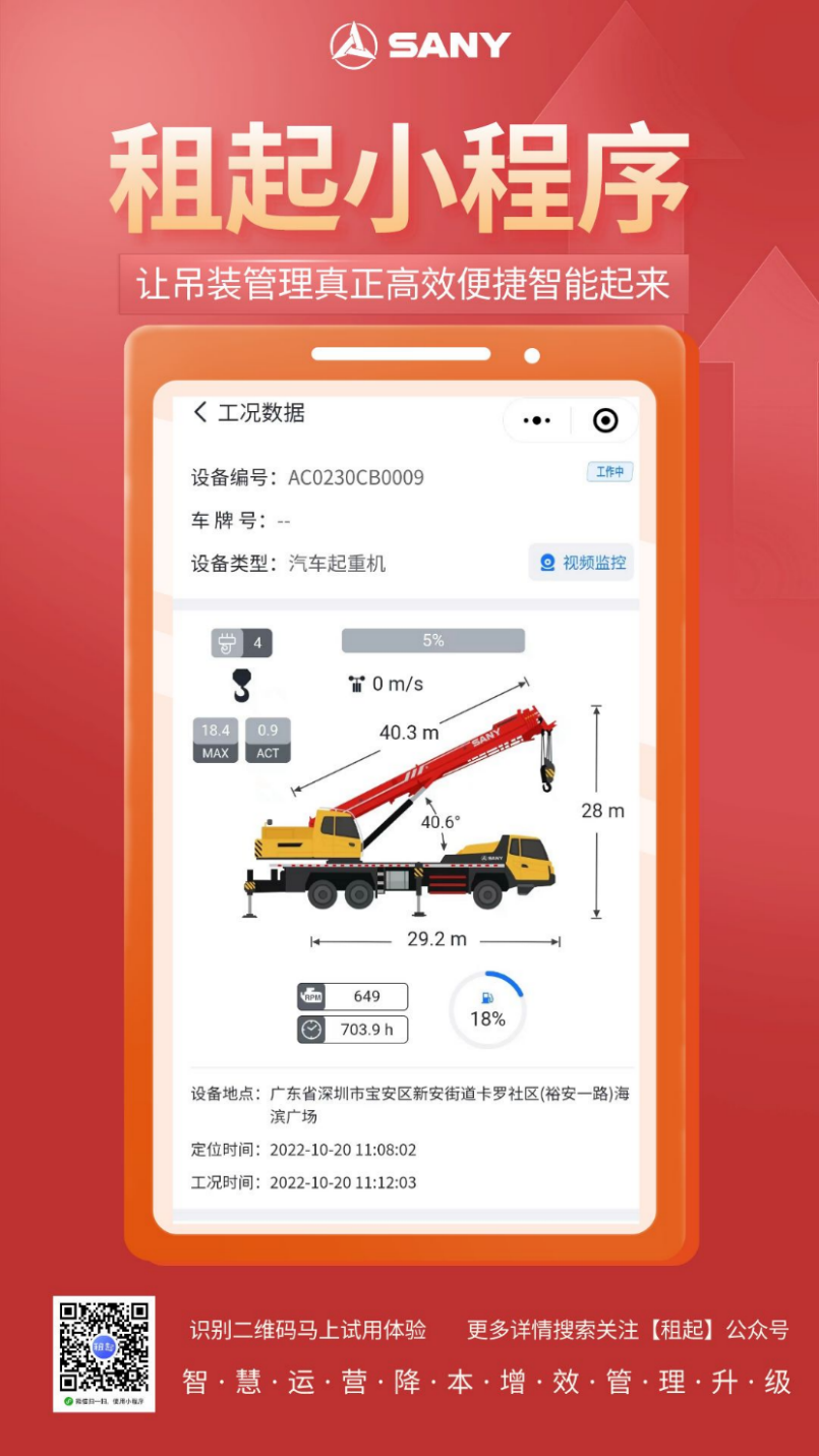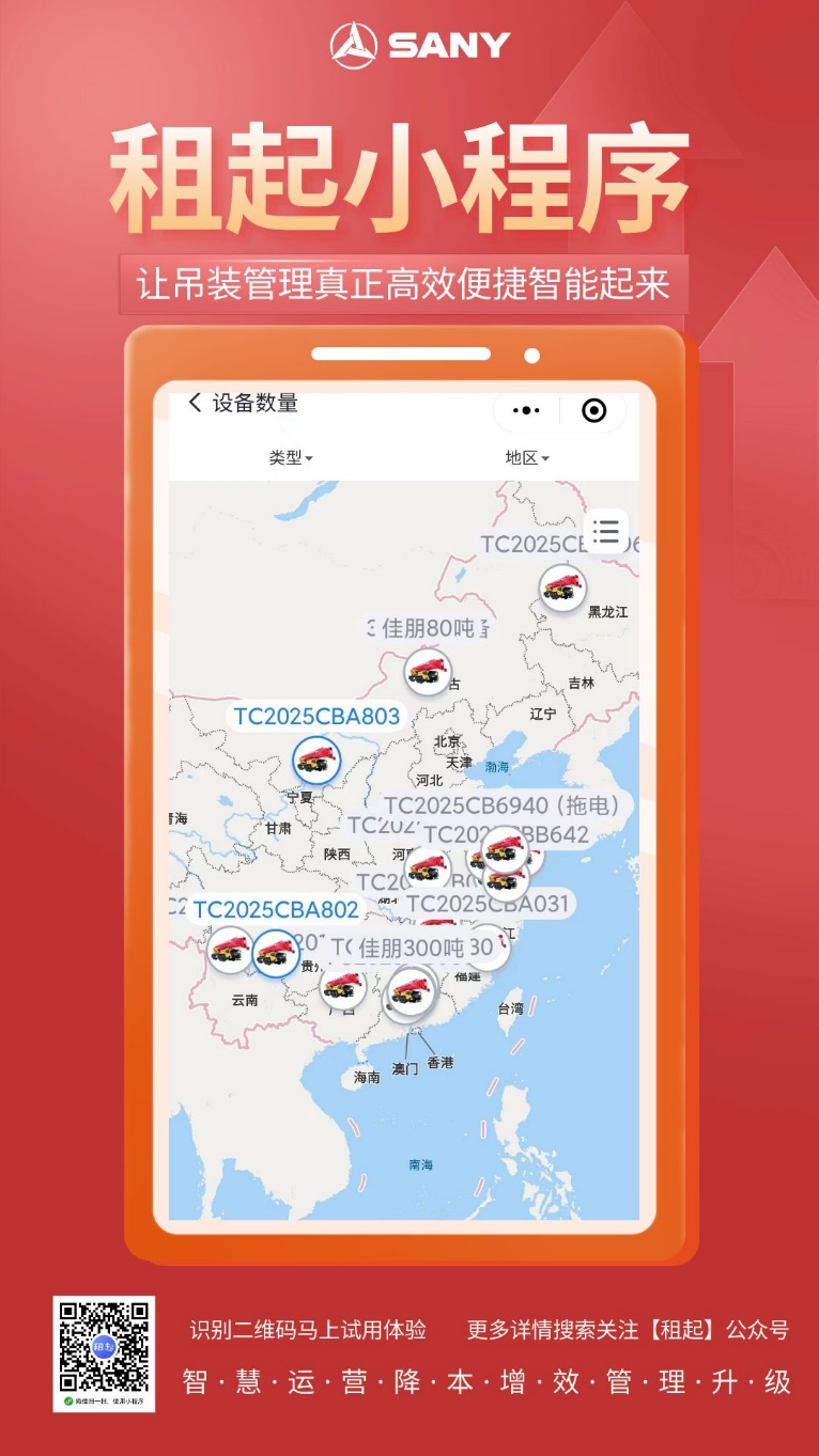 三一 “租起”微信小程序正式上线啦!1.0版本集合了设备管理、巡检管理、吊臂计算器三大实用王牌功能,致力于给吊友们提供更高效、更便捷的使用体验。