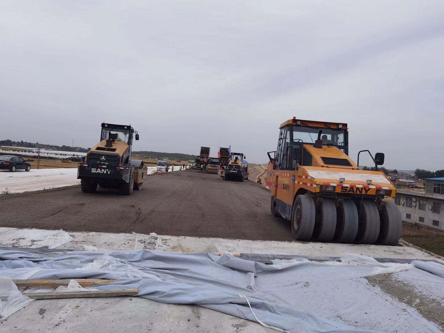 三一路机在该项目第五工区共投入SSP125C-8摊铺机两台、SSP90C-8摊铺机两台、SSR260AC-8压路机两台、STR130C-8双钢轮压路机两台、SPR300C-8胶轮压路机两台、LB4000沥青站等,同时三一起重机、泵车等产品也进入该项目,为三一集团各分公司共同协作探索出了一条金色之道。
