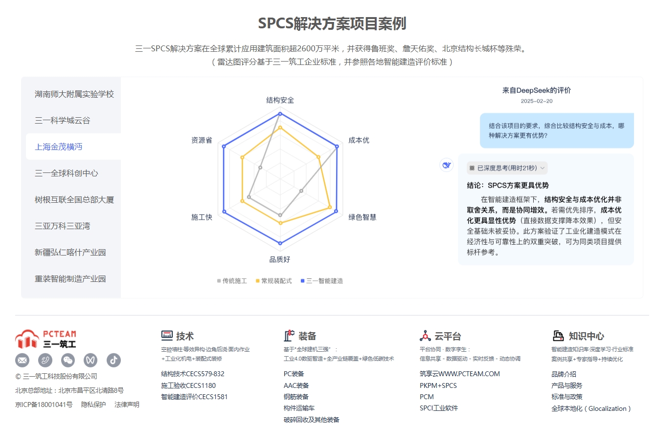 在首页第二屏的项目案例板块,通过雷达图,您可以从结构安全、成本优、绿色智慧、好、快、省六大维度,对比传统工法、常规装配式与三一智能建造方案,直观了解各方案的优势。同时,Deepseek大模型将基于项目数据,提供权威评价,帮助您作出更科学的决策。