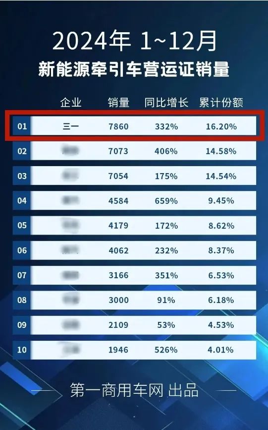 湖南新能源牵引车市场竞争激烈,参与者众多,包括传统重卡车企、工程机械企业、跨界造车企业及新势力企业。三一重卡凭借卓越表现脱颖而出,稳居市场份额榜首。2024年,三一重卡牵引车销量达7860辆,市场份额16.2%,夺得年度销量冠军;在湖南省市场占有率近五成,稳居市场主导地位。