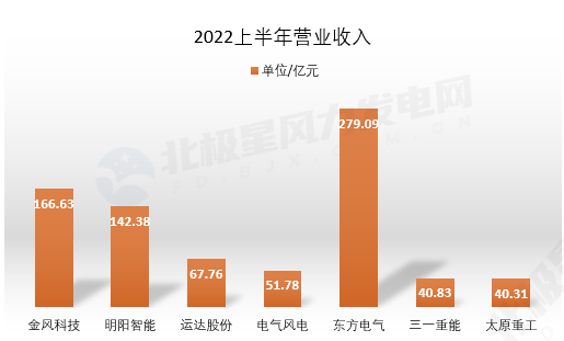 从2022上半年营业收入看,金风科技、明阳智能、东方电气(含其其他电源板块收入)保持在百亿以上;明阳智能、运达股份、东方电气、三一重能、太原重工营业收入稳步增长。