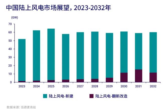 伍德麦肯兹表示,陆上风电翻新改造市场在中长期呈现出强劲的增长态势,近62GW的老旧风机将在预测期内完成翻新改造,助力中国成为全球最大的翻新改造市场。
