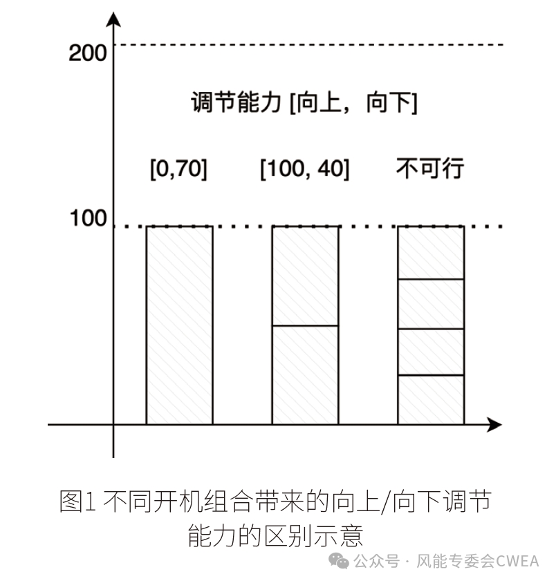 举一个示意性的例子(图1),如果需求量为100,可以用1台100额度功率的机组来满足,则进一步上行潜力为0,下行潜力为70(最低稳燃出力为30%)。然而,如果用2台100额度功率的机组(每台机组出力为50)来满足,则上行潜力为100,下行潜力为40。如果使用4台100额度功率的机组(每台机组出力为25),那么开机组合将是无解的,因为没有机组可以将出力压到25。