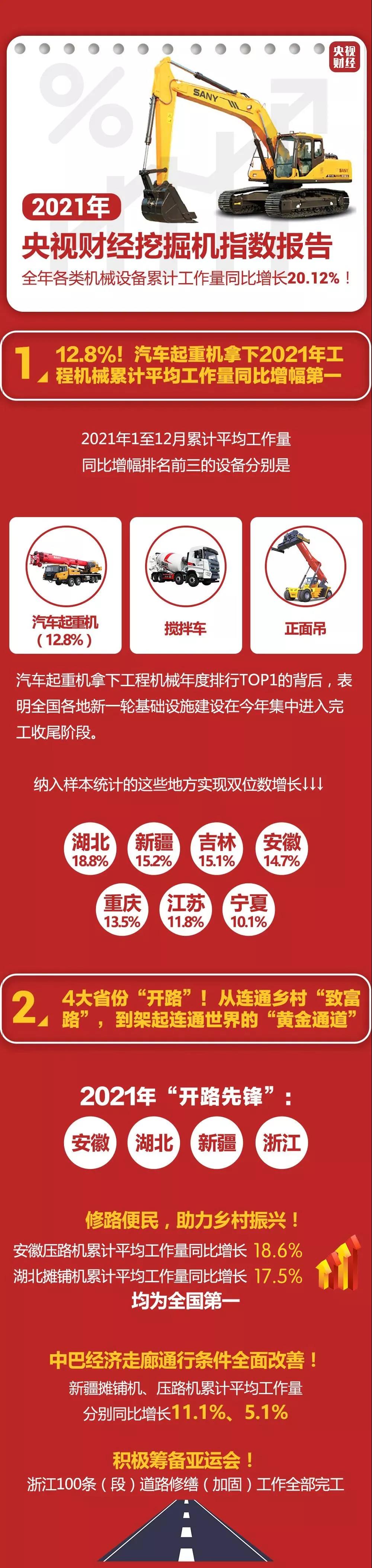 2021年我国持续加大基础设施建设力度,为社会经济发展注入强劲动力。央视财经挖掘机指数显示,2021年我国各类工程机械设备累计工作量同比增长20.12%!