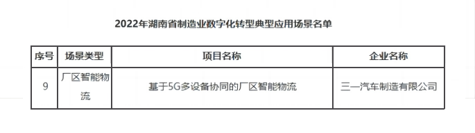 近日,湖南省工业和信息化厅公布2022年湖南省制造业数字化转型典型应用场景名单,三一“基于5G多设备协同的厂区智能物流”项目榜上有名,彰显数智化转型硬实力。