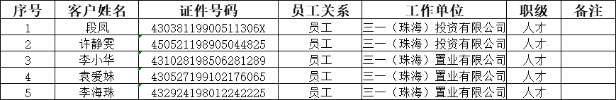 为增加员工归属感,我司开发位于珠海市金湾区平沙镇铭恩路31号【三一蓝海花园项目】用于引进行业人才,为保障房住不炒的居住用途及员工购房资格合规性,根据我司制定的《关于三一蓝海花园购房资格管理办法》,现对购房名单做如下公示: