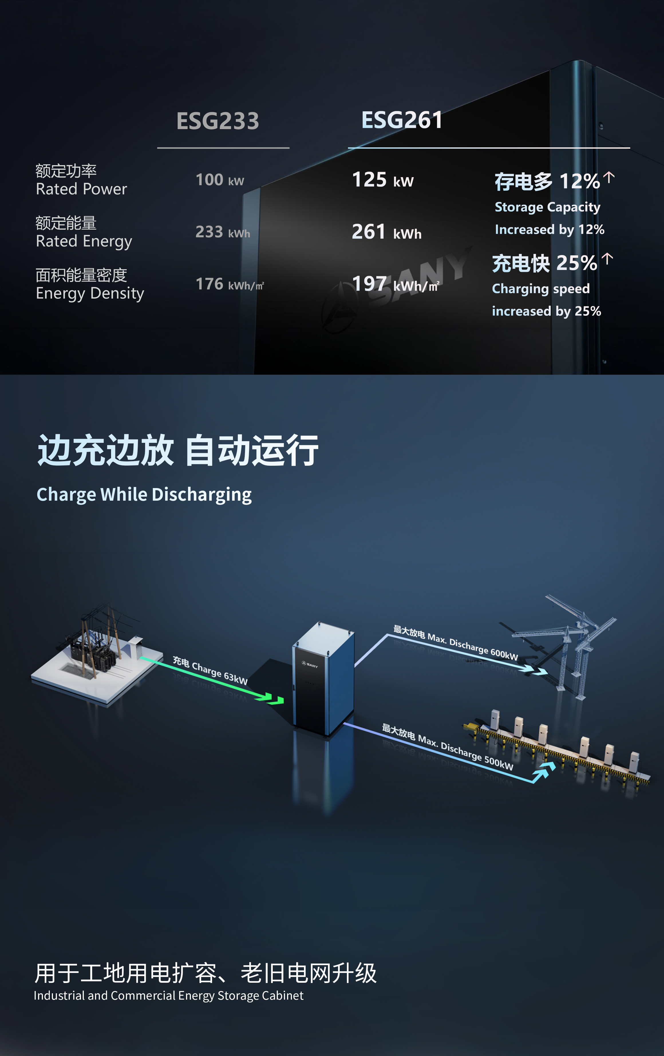性能升级:新一代 ESG261 相比 ESG233,存电多 12%、充电快 25%,面积能量密度也更高,更智能高效。