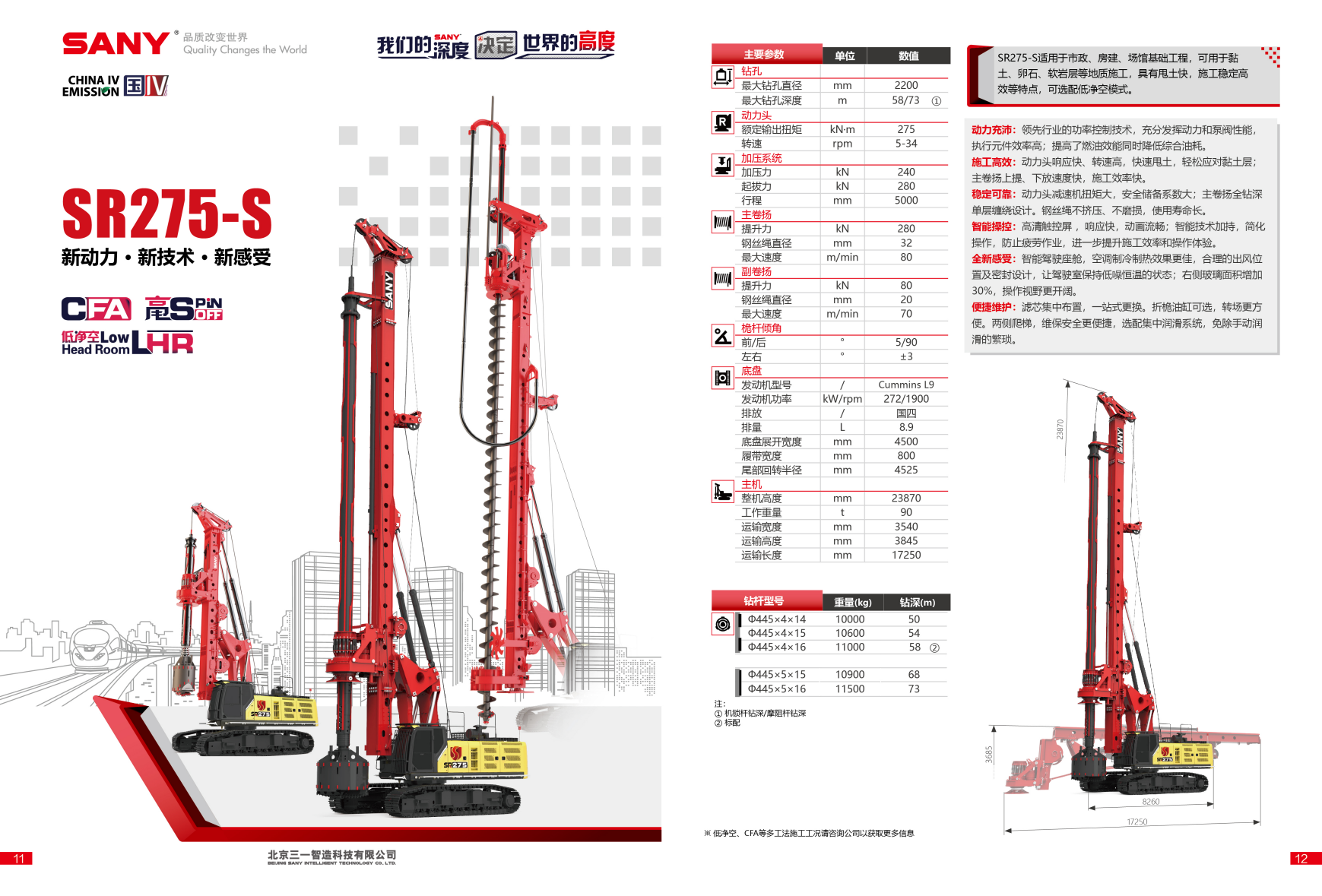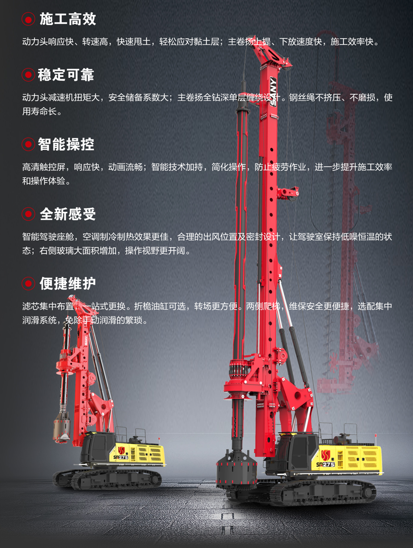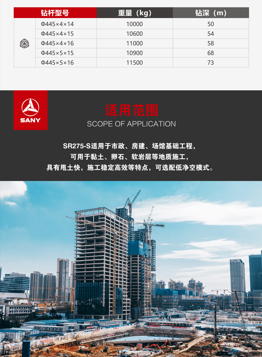 SR275-S适用于市政、房建、场馆基础工程,可用于黏土、卵石、软岩层等地质施工,具有甩土快,施工稳定高效等特点,可选配低净空模式。