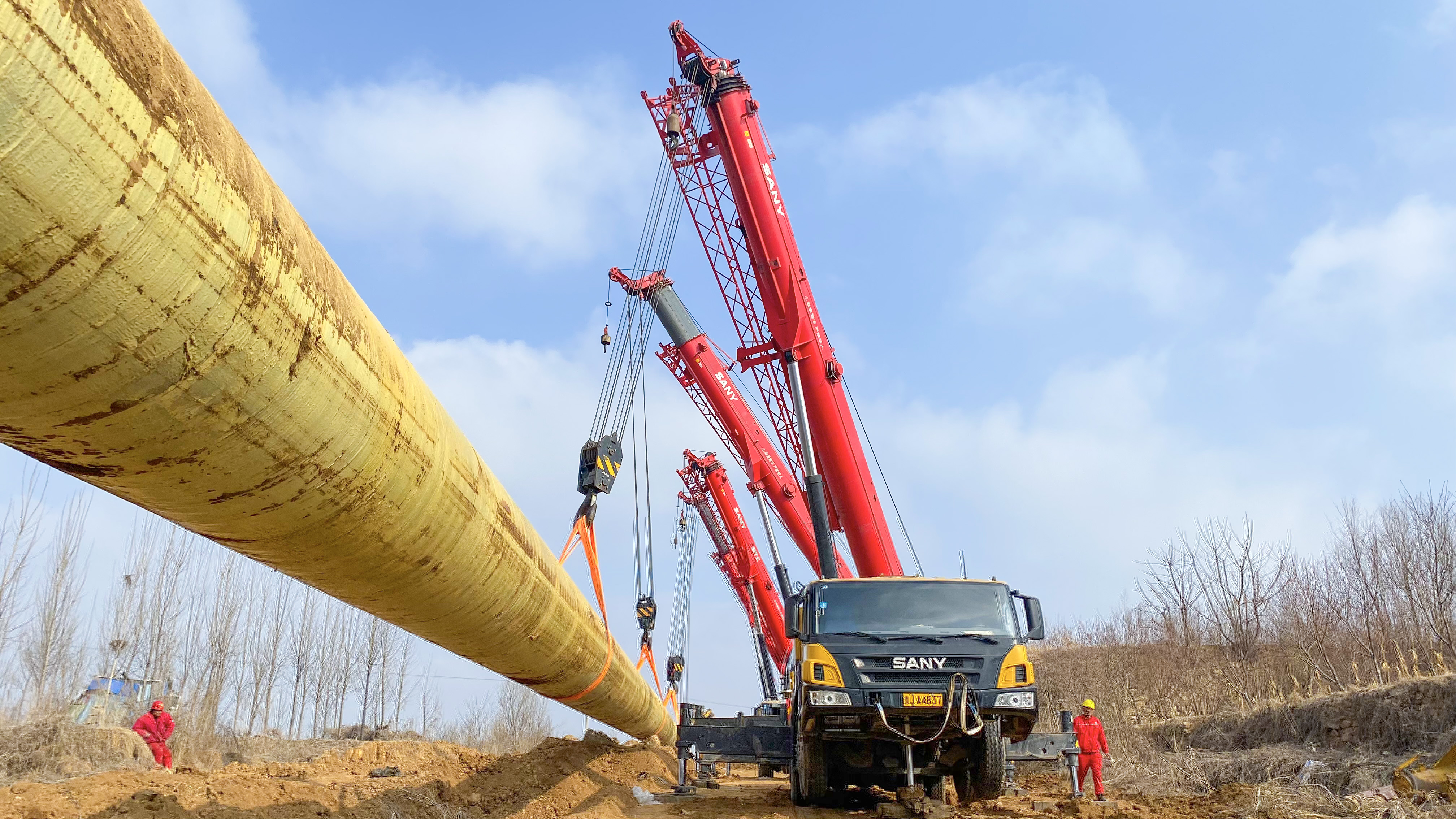 “三一起重机在管道的后半段进行吊载,四台三一起重机配合度高效率快,6-8分钟左右吊起移动一次,比原定的吊载速度快了近两倍。2天内就完成了起重机吊载回拖的施工。”