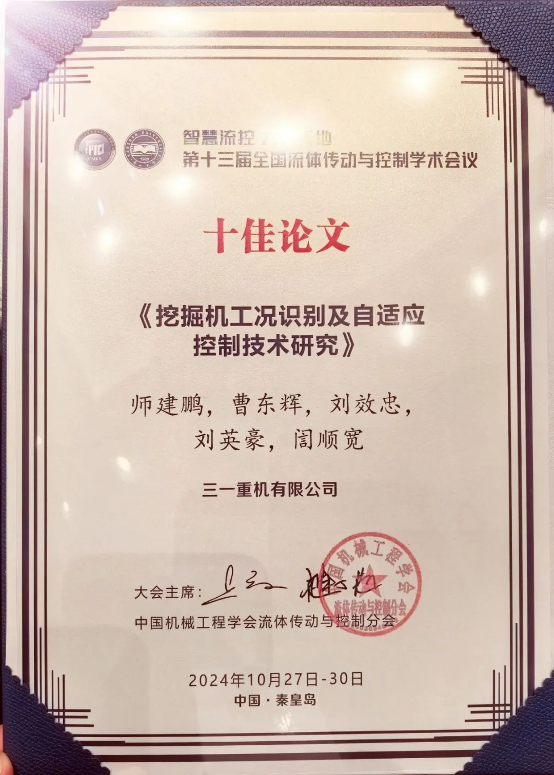 本次会议共涉及105所高校,80多家企业,超1000人参会,投稿近400篇论文。其中,三一重机有限公司总工程师曹东辉,大挖研究院副所长师建鹏及团队投稿的《挖掘机工况识别及自适应控制技术研究》论文成功入选为十佳论文。