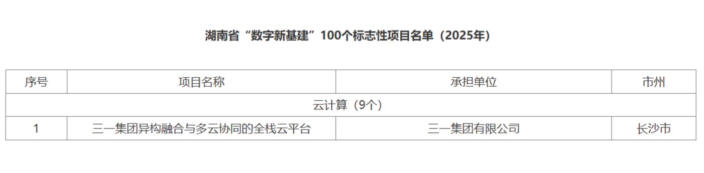 近日,湖南省工业和信息化厅确定了《湖南省“数字新基建”100个标志性项目名单(2025年)》。三一集团自主研发的“异构融合与多云协同的全栈云平台”入选云计算标志性项目。