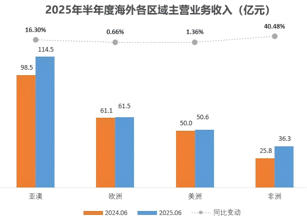 各区域收入情况如下:亚澳区域114.55亿元,增长16.3%;欧洲区域61.52亿元,增长0.66%;美洲区域50.65亿元,增长1.36%;非洲区域36.30亿元,增长40.48%。