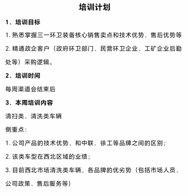 培训于每周渠道会结束后开展,本周聚焦清扫类、清洗类车辆,重点拆解三大板块:1.对比分析三一产品与中联、徐工等品牌的技术差异,让团队能精准讲出“人无我有、人有我优”的核心竞争力;2.复盘该类车型在西北区域的过往业绩,提炼市场拓展的成功经验;3.梳理西北市场清洗类车辆各品牌的优劣势,从市场人员、公司政策、售后服务等维度为团队提供“作战地图”。以学促战,赋能市场“懂产品、懂客户、懂市场,才能更好地服务客户。”西北大区李总表示,后续培训还将持续覆盖更多产品品类与客户场景,通过“学练结合”让每一位成员都成为能打硬仗的“环卫装备专家”,为西北区域客户提供更专业的服务,助力三一环卫在西北市场再创新佳绩。