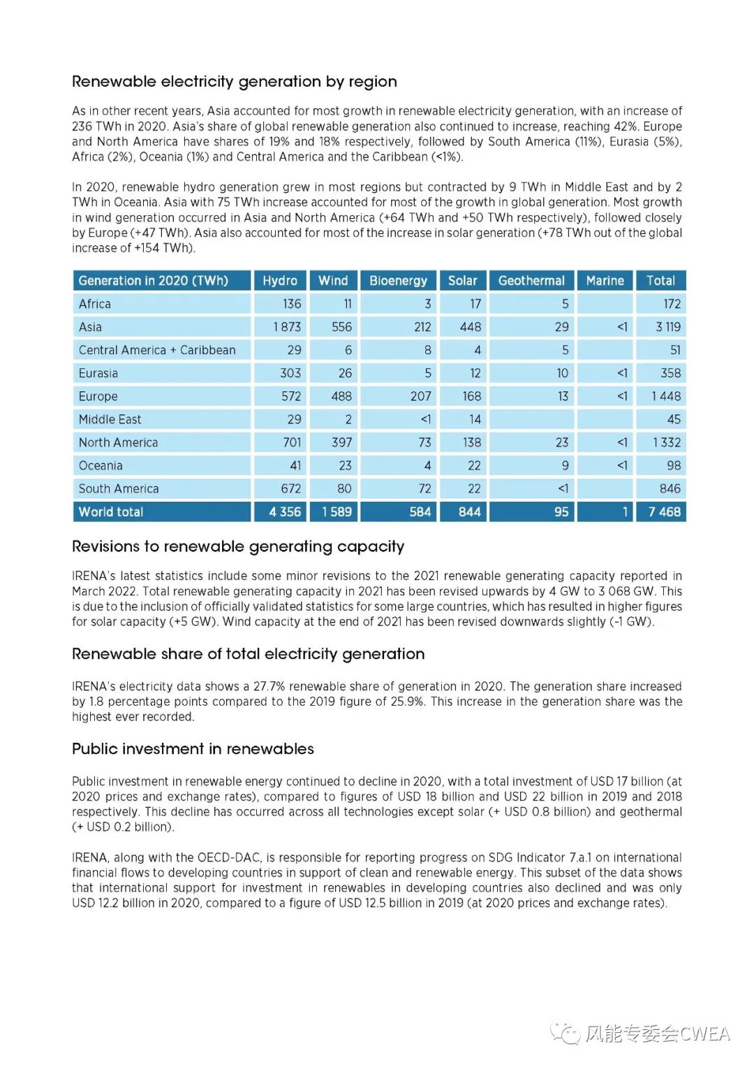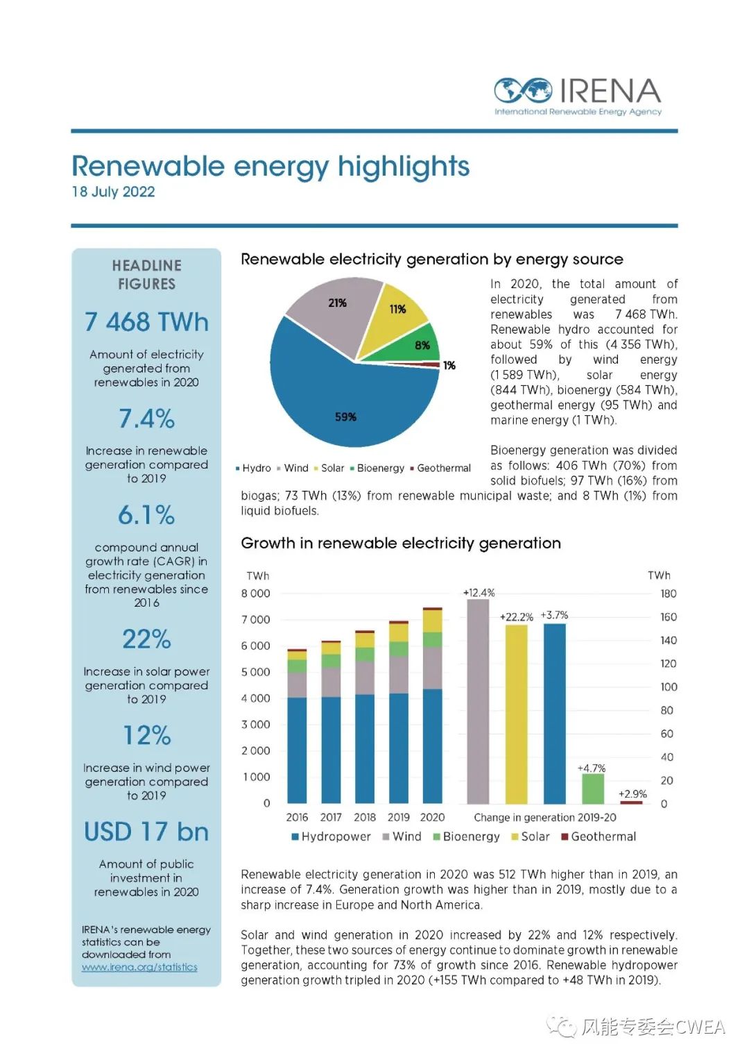 关键数据:2020年全年可再生能源发电量7468TWh,比2019年增长7.4%,自2016年以来,可再生能源发电复合年增长率6.1%,太阳能比2019年增长22%,风电发电比2019年增长22%,可再生能源在2020年的公共投资总额170亿美元。