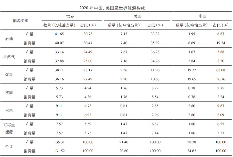 2020 年,全球能源消费中,石油占比约为31%、天然气占比约为25%、煤炭占比约为27%、新能源占比约为17%,形成煤、石油、天然气、新能源“四分天下”新格局。中国的地下资源禀赋决定了能源供给以煤炭为主,在能源消费中占比约为56%,石油消费占比20%,天然气消费8%,新能源消费占比16%,形成以煤炭为主的“一大三小”格局。