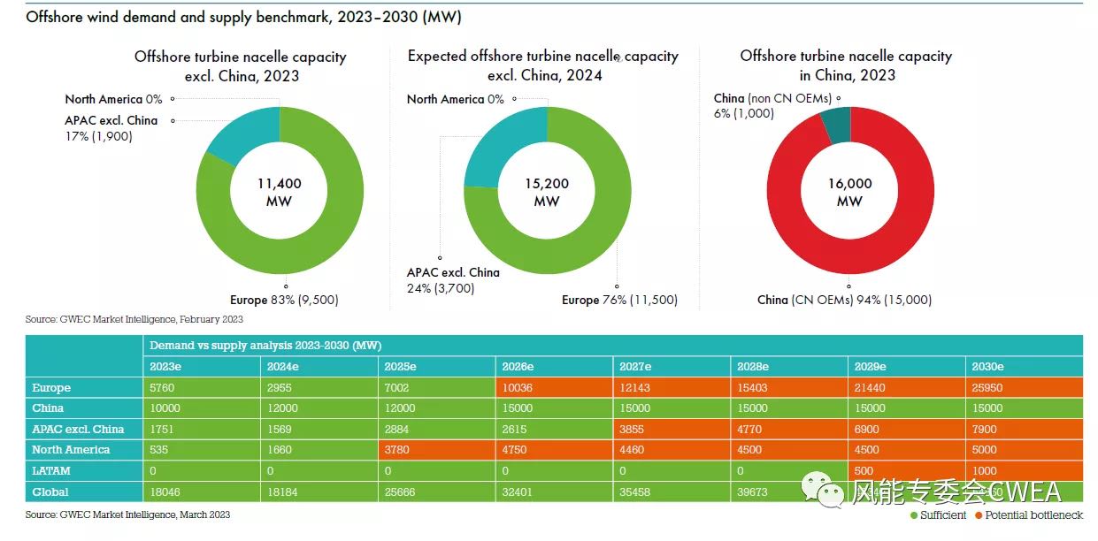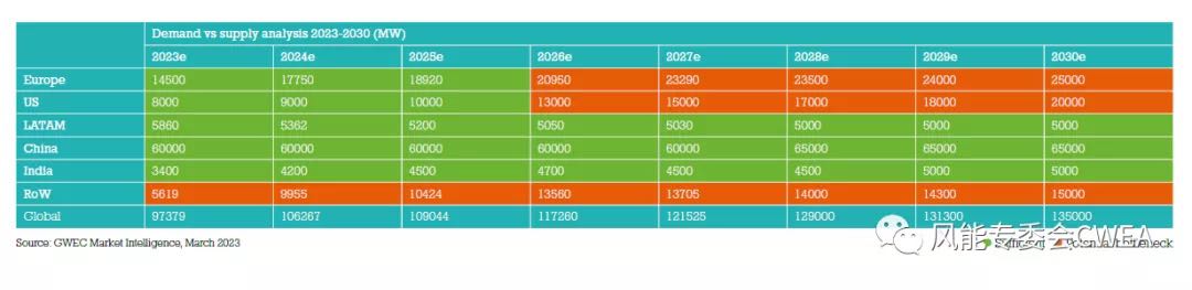 正如《2023全球风能报告》分析指出的那样,现在迫切需要在全球范围内加大对供应链的投资,以满足需求的快速增长。GWEC的报告显示,美国和欧洲可能会在2025年出现风机和部件的供应瓶颈,因为美国《降低通胀法案》和欧洲新能源目标的调整对风能发展将产生积极影响。