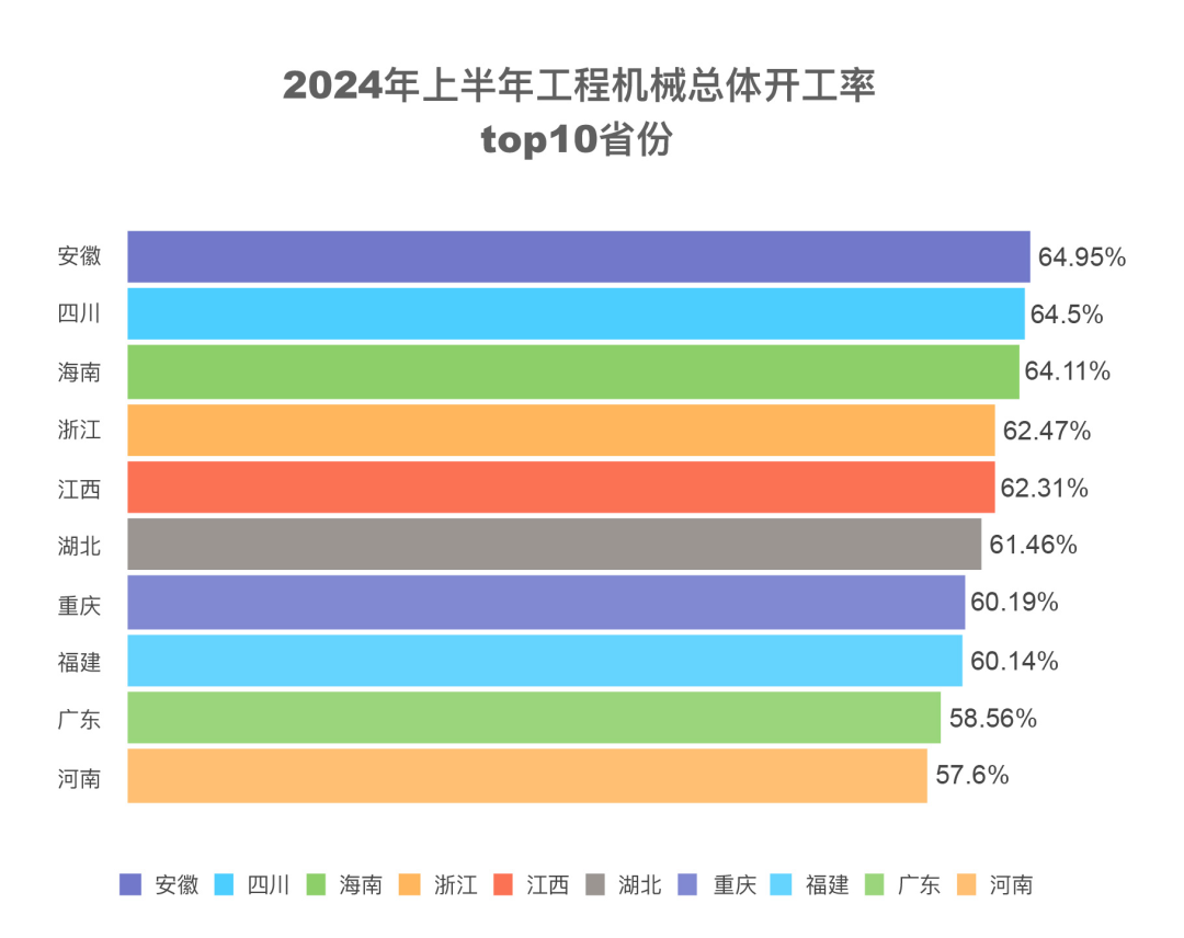 上半年,全国工程机械开工率为48.97%,安徽、四川、海南、浙江、江西、湖北、重庆、福建,开工率均超过60%。其中,安徽连续四个月开工率位居全国第一,拿下“上半年、第二季度、6月”综合开工率“三连冠”。