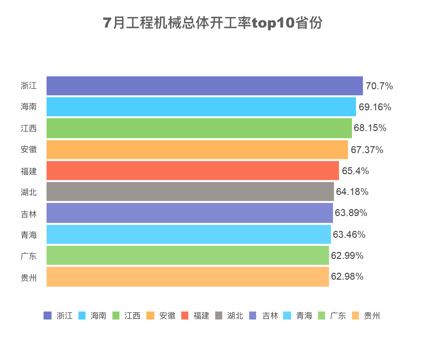 7月,全国工程机械开工率为50.05%。全国工程机械的总工作时长增长6908501.17小时,环比增幅2.94%,一定程度上表明在建项目全面提速。