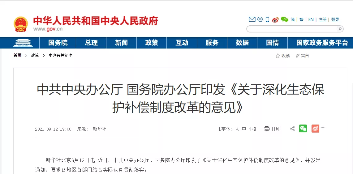 近日,中共中央办公厅、国务院办公厅印发了《关于深化生态保护补偿制度改革的意见》,并发出通知,要求各地区各部门结合实际认真贯彻落实。