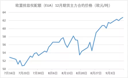 欧盟碳市场是世界上最早成立且发展最为成熟的碳市场,拥有目前全球最高碳价。8月30日,欧盟碳市场期货价格突破60欧元/吨,达2005年成立以来的最高点,且进入9月后碳价仍在持续上升。与今年年初相比,欧盟碳价已上涨近八成。