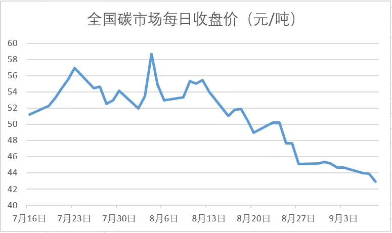 8月中下旬之后,开市带来的热度逐渐褪去,我国碳市场活跃度有所降低,碳价从50多元/吨降至40多元/吨,单日成交量也大幅下跌。