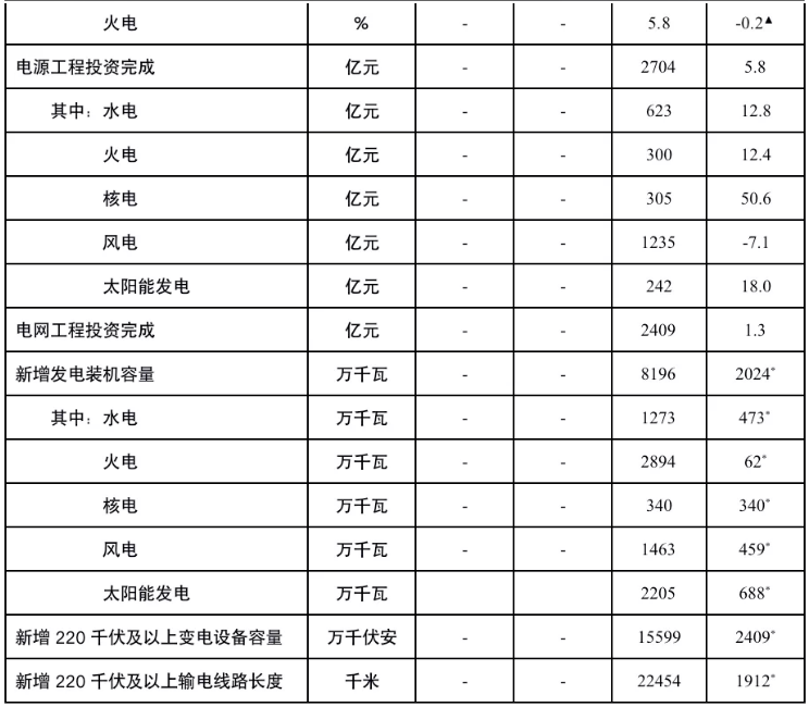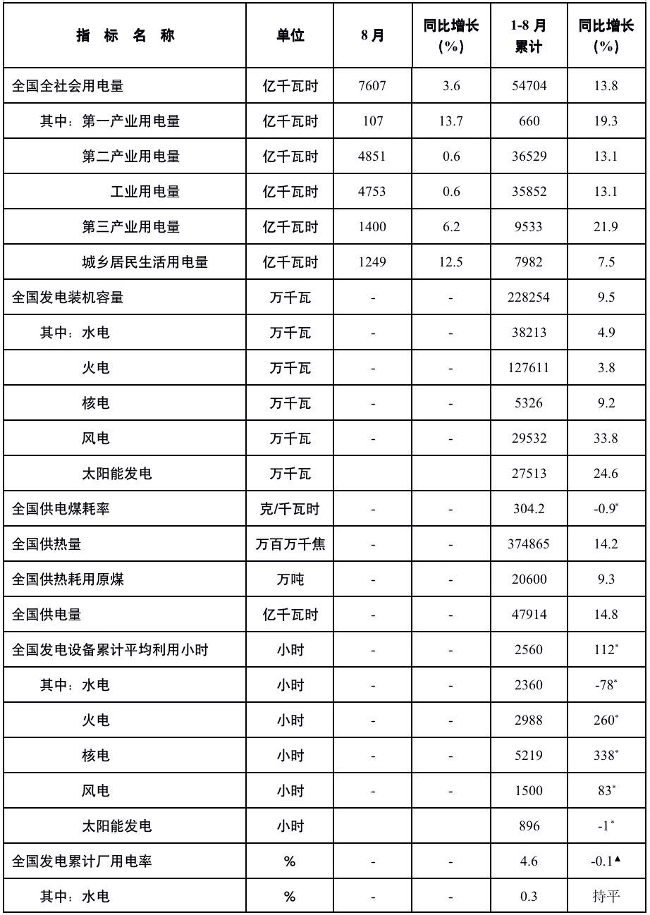 注:1.全社会用电量为全口径数据,全国供电量为调度口径数据。2.“同比增长”列中,标*的指标为绝对量;标▲的指标为百分点。CWEA