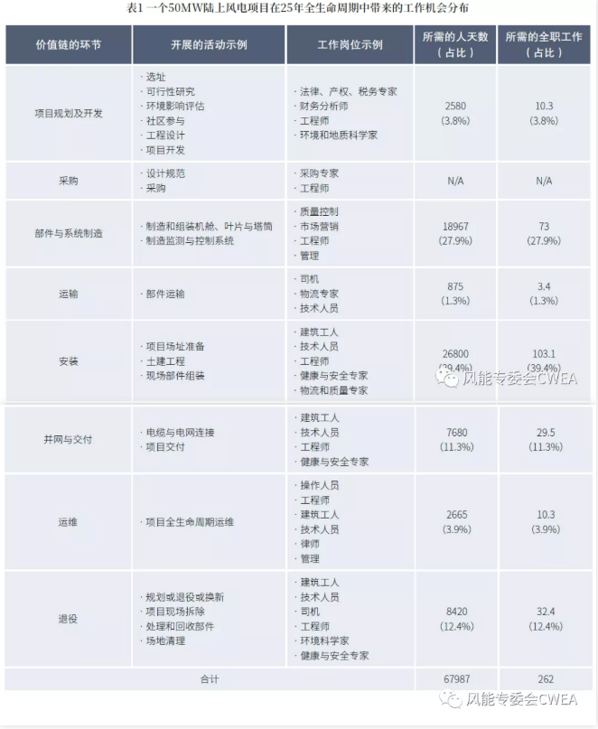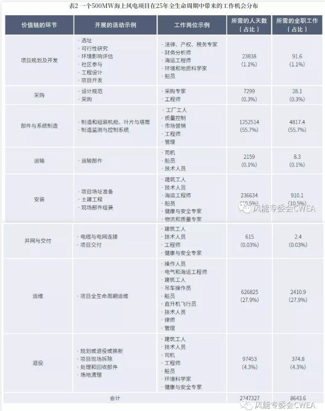 国际可再生能源署(IRENA)的研究显示,一个典型的50MW陆上风电项目在其25年全生命周期中,单位兆瓦装机将带来5.24个工作机会。一个典型的500MW海上风电项目在其25年全生命周期中,单位兆瓦装机会带来17.29人年(person-years)的工作机会。