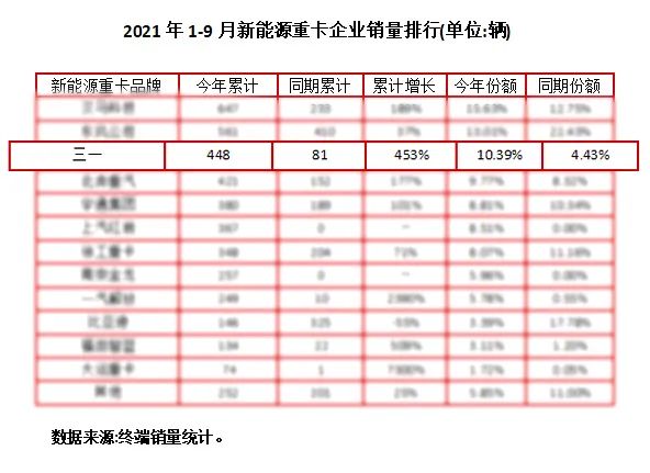 这是三一电动重卡首次跃升至新能源重卡终端销量月榜冠军,9月份的良好表现也让三一以448辆的累计销量一举进入2021年新能源重卡累计销量前三甲!要知道,今年1-8月三一新能源重卡的销量还只是前八名,一个月过去,三一电动重卡在排位赛中火速上升5名之多!