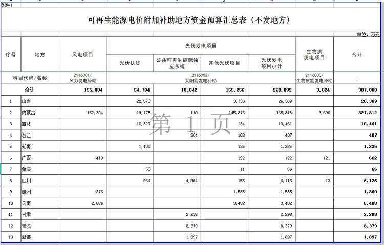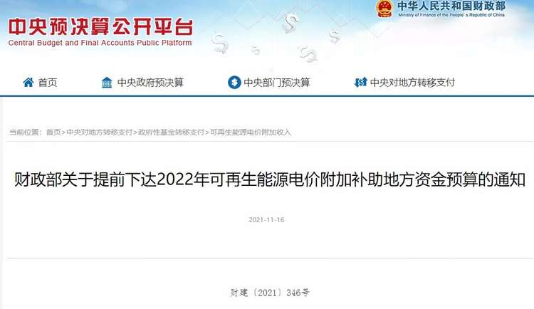 风电观察消息:11 月 16日,中央预算公共平台发布“关于提前下达2022年可再生能源电价附加补助地方资金预算的通知”。根据通知,本次下达总计新能源补贴资金38.7亿元。其中,风电15.5亿元、光伏22.8亿元、生物质3824万元。
