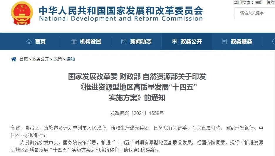 近日,国家发改委印发了《推进资源型地区高质量发展“十四五”实施方案》。方案提出,要保障国家资源能源安全,加强资源能源保障能力建设。加大石油、天然气、铜、铬、钨、稀土、晶质石墨等战略性矿产资源勘查,做好重要矿产资源战略接续。