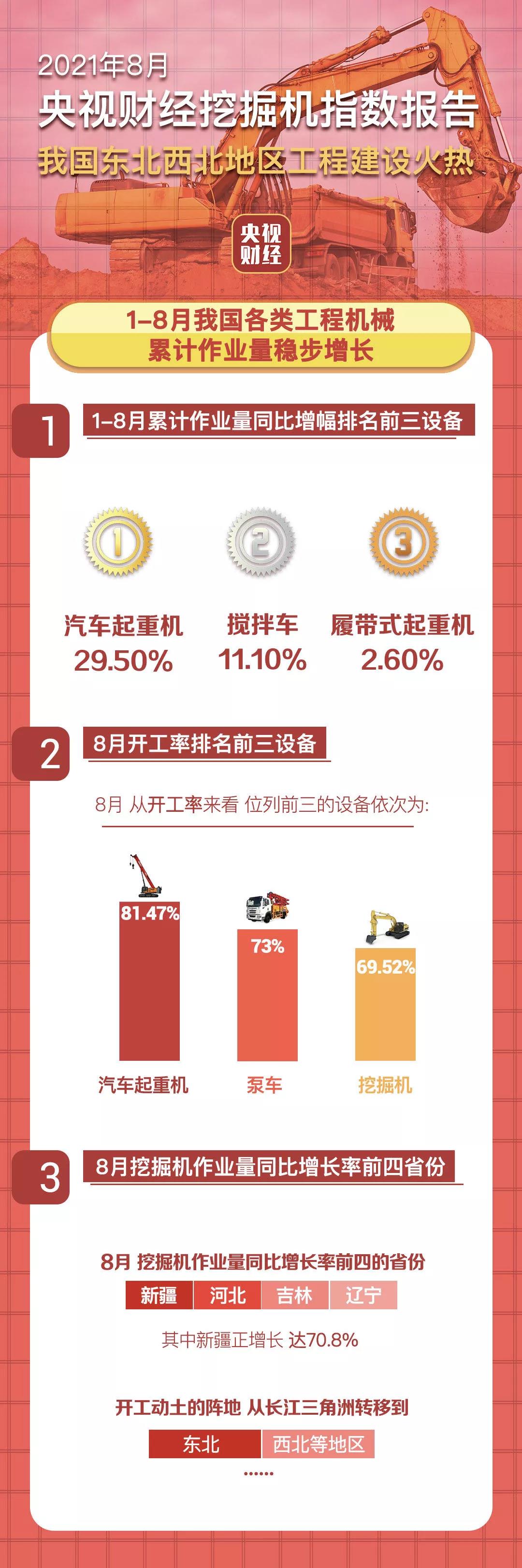 新疆8月份挖掘机作业量提升显著,同比增长率高达70.8%,成为8月份最大黑马。