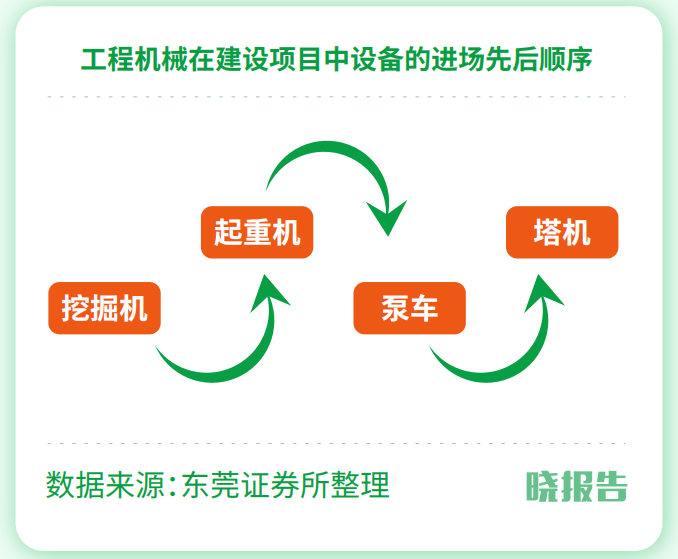 盖一栋楼,要先挖坑打地基、再打柱梁,一层层往上盖。对应到主要三大设备,出场顺序大致是:挖掘机—搅拌车—塔机。