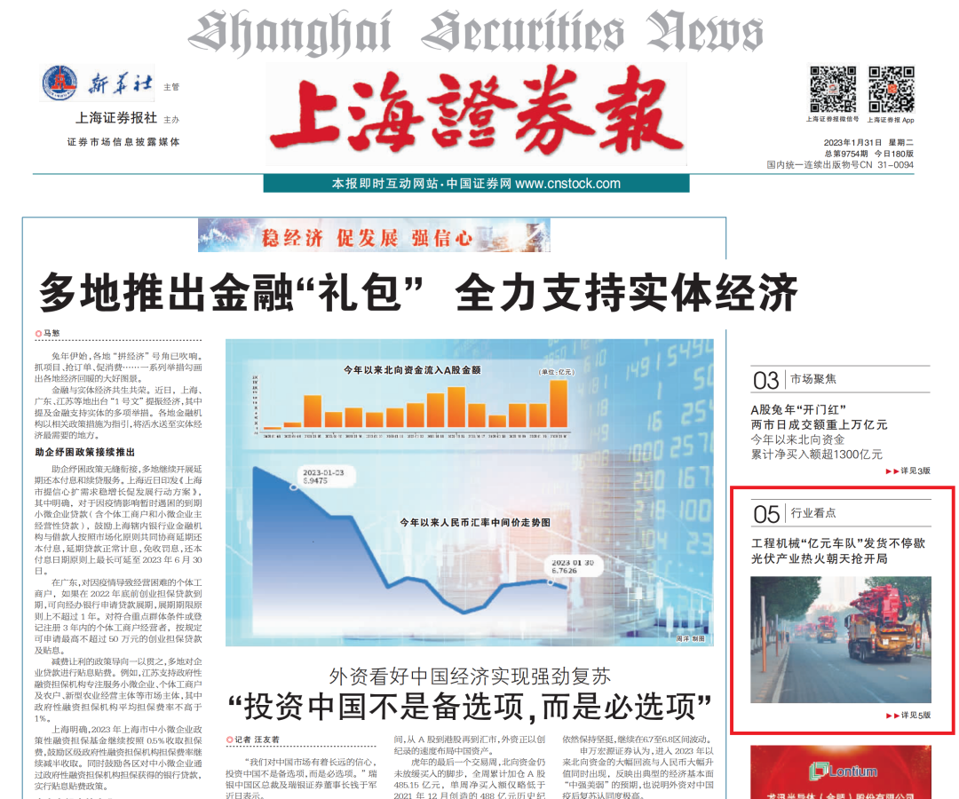 1月31日,《上海证券报》刊发《工程机械“亿元车队”发货不停歇》一文,透过三一集团各产业园一派热火朝天忙发货、忙签约的火热景象,展现工程机械行业新春开门红。