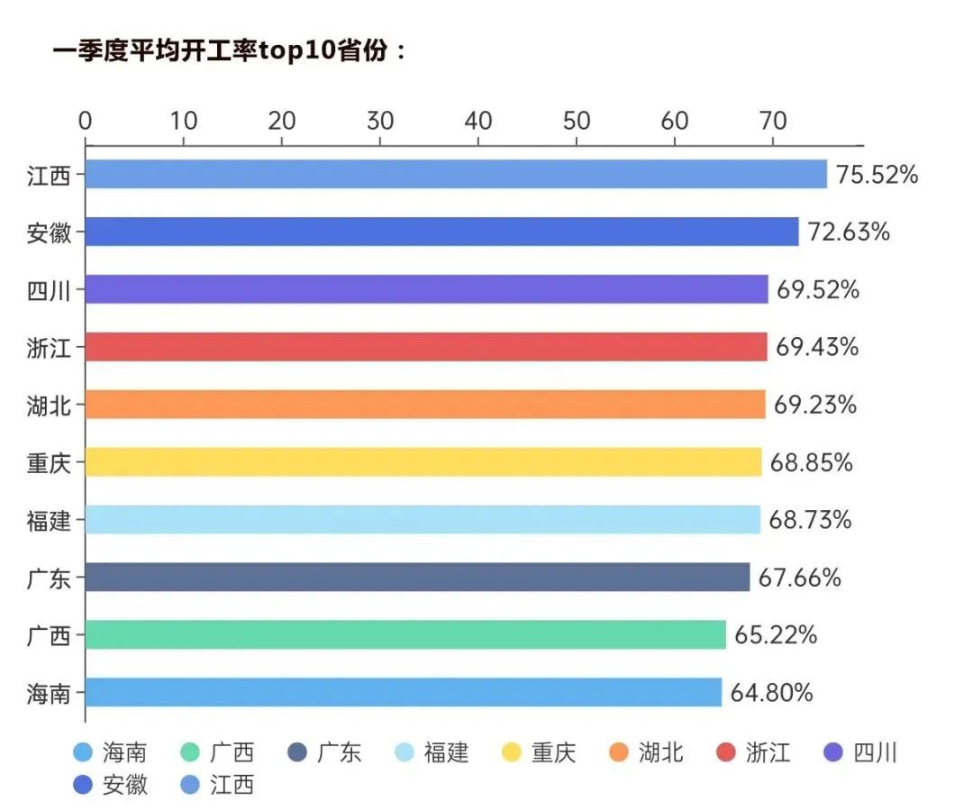 一季度,全国范围来看,汽车起重机开工率最高,一季度平均开工率为72.85%;其次是挖掘机,一季度平均开工率为55.22%。