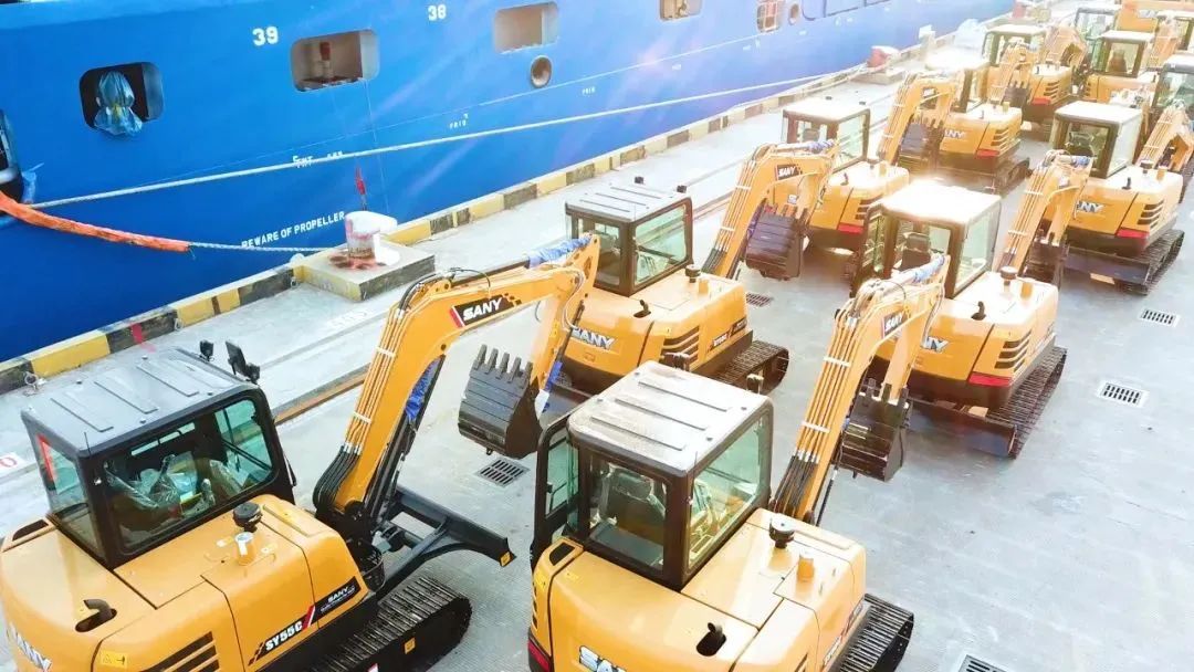 码头前沿,一台台等待装船的三一装备排成了长龙,黄色涂装的挖掘机、装载机、绿色涂装的自卸车、红色涂装的起重机、泵车,在阳光的照耀下,显得尤为夺目。