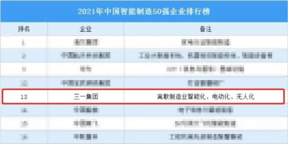近日,中国科学院主管的《互联网周刊》重磅发布2021年中国智能制造50强,三一集团成功入选TOP50,位列第13名,是榜单排名最高的工程机械企业。