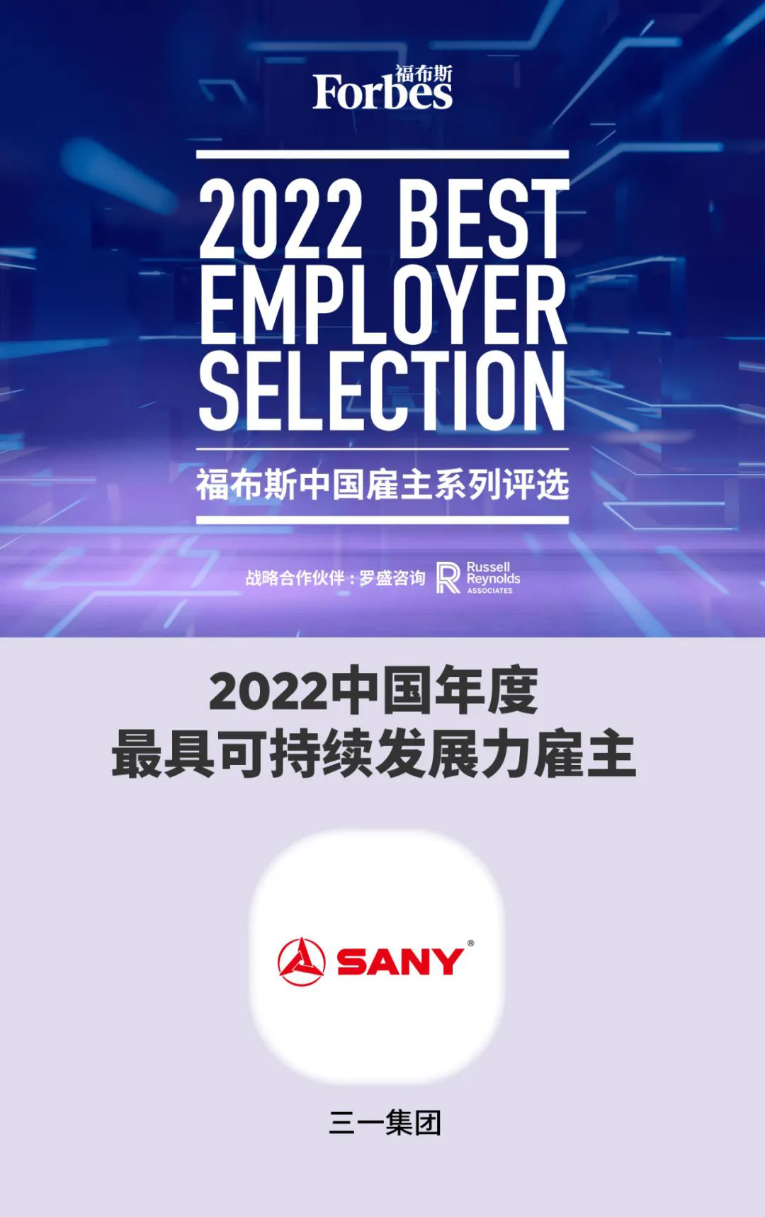 7月8日,福布斯中国联合全球领导力咨询公司——罗盛咨询公司正式发布2022福布斯中国•最佳雇主系列评选结果,三一集团荣获“2022中国年度最具可持续发展力雇主”称号,是榜单中唯一的装备制造企业。