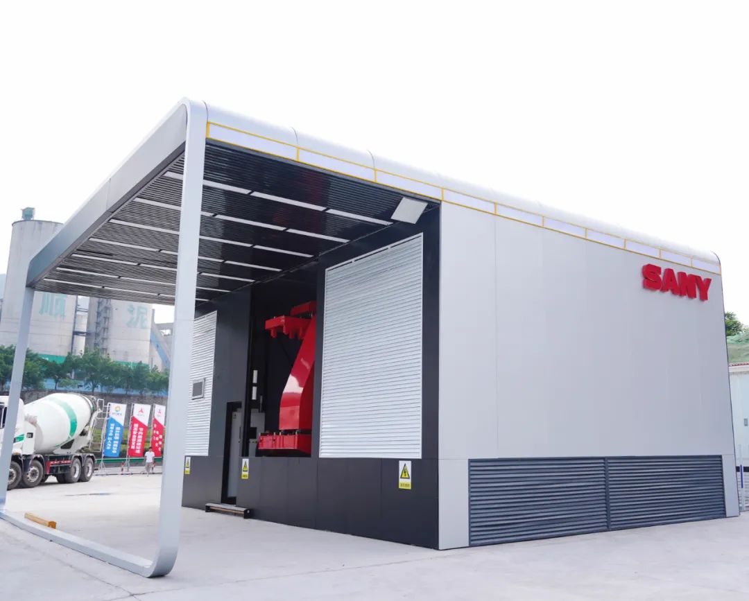 1号站单车换电仅1.9分钟,配备了三一自研站控系统、自研换电运营平台与自研车辆,高度智能化。三一换电站站高仅5.8米,占地面积约120平米,站内配备7块电池,支持顶换、侧换2种换电模式,能同时支持牵引车、自卸车、搅拌车等多种车型,适用于物流园、货运站、搅拌站、矿山、港口、钢厂等短途倒运场景。