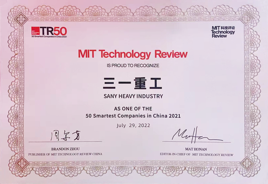 7月29日,在全球最具影响力的科技会议风向标EmTech China全球新兴科技峰会上,三一重工被《麻省理工科技评论》评为年度“50家聪明公司”,获得全球范围的关注和认可。