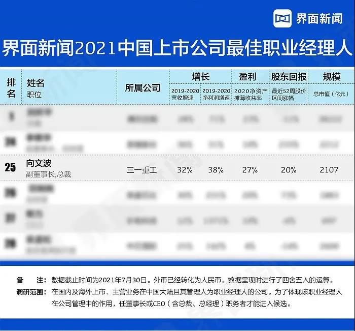 近日,界面新闻发布2021中国上市公司最佳职业经理人榜单,列出了50位优秀的职业经理人,三一重工总裁向文波榜上有名,位列第25,同时也是工程机械行业的最佳职业经理人。