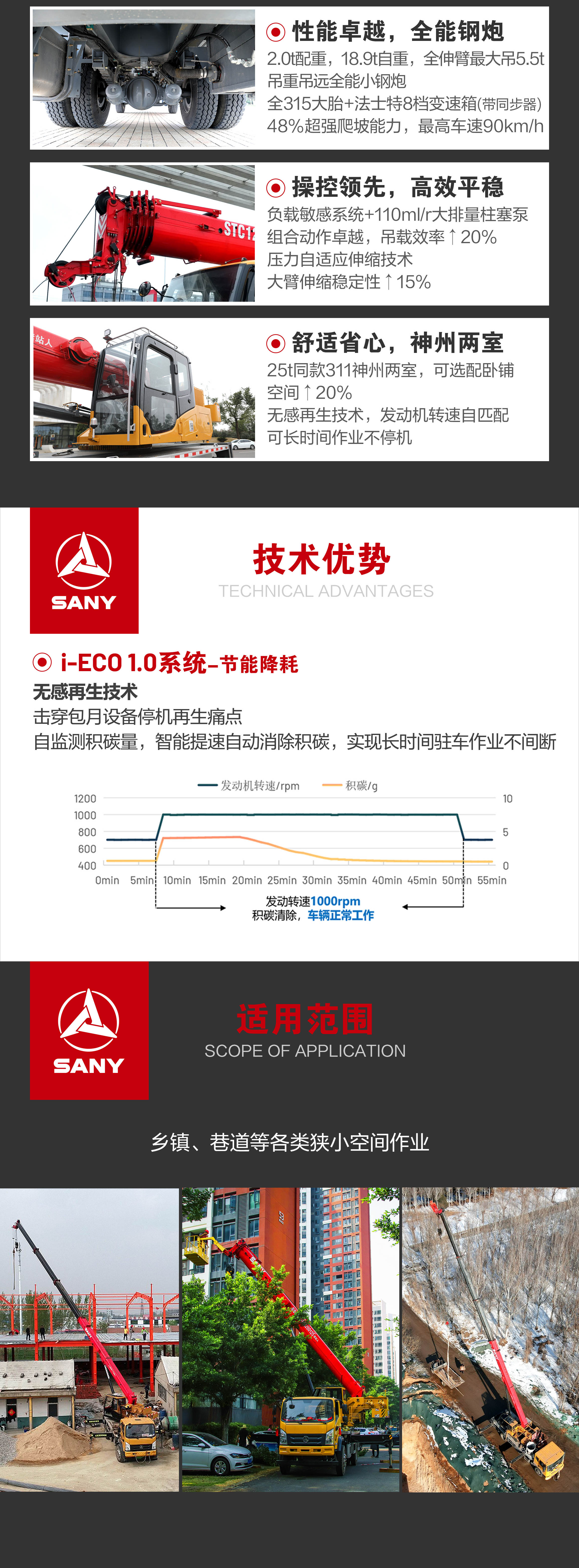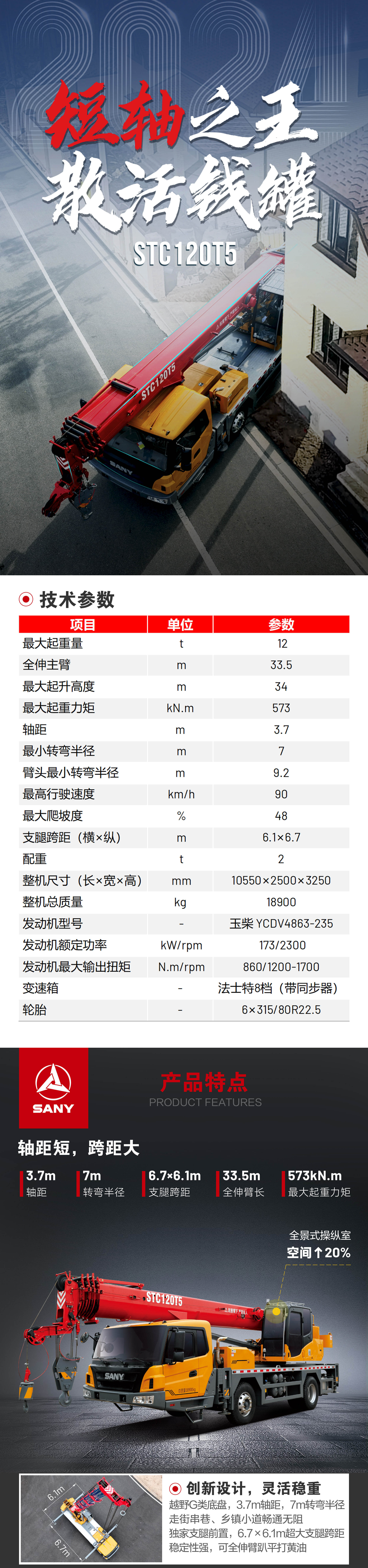 2.0t大配重,18.9t自重,全伸臂最大吊重5.5t,吊重吊远全能小钢炮