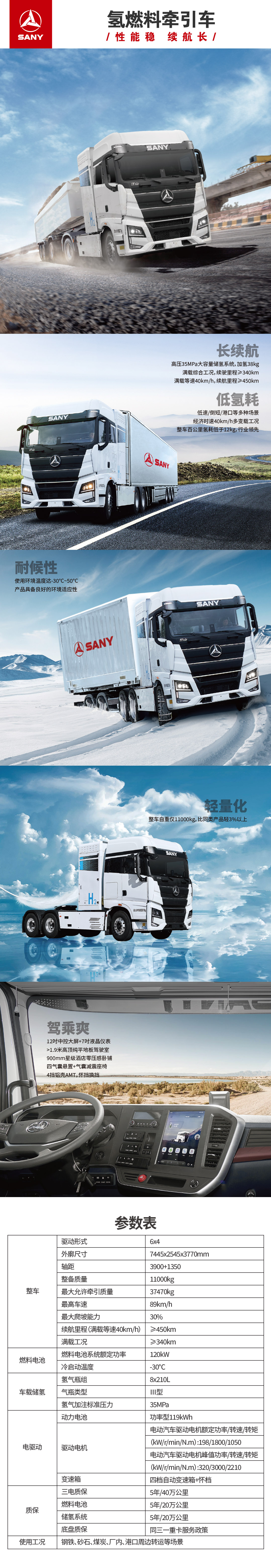三一氢燃料重卡采用大功率永磁同步电机,额定功率250kW,最大扭矩为2400N·m ,电机效率高达95%以上,拥有低氢耗、长续航、轻量化、耐候性、驾乘爽等五大优势,搭配三一制加氢一体站,为客户提供成本更可控的零碳运营模式。