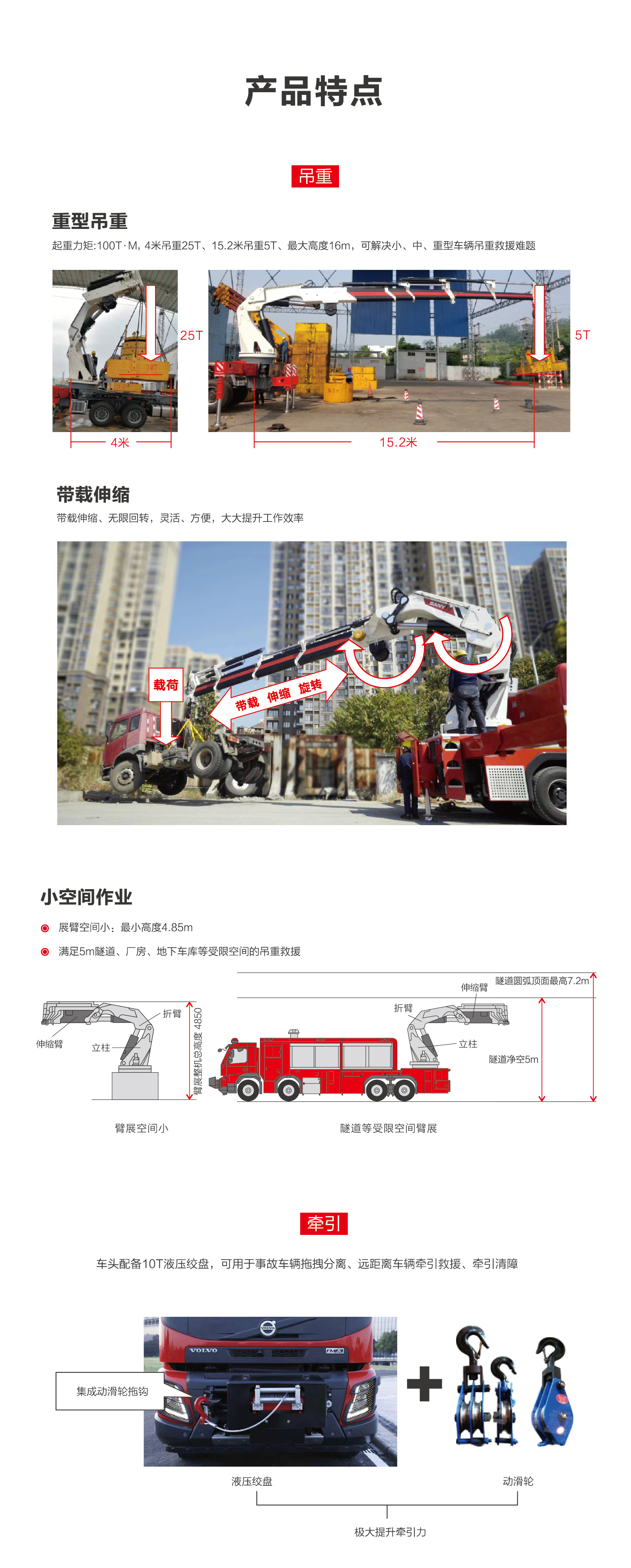 起重力矩:100T·M,4米吊重25T、15.2米吊重5T、最大高度16m,可解决小、中、重型车辆吊重救援难题