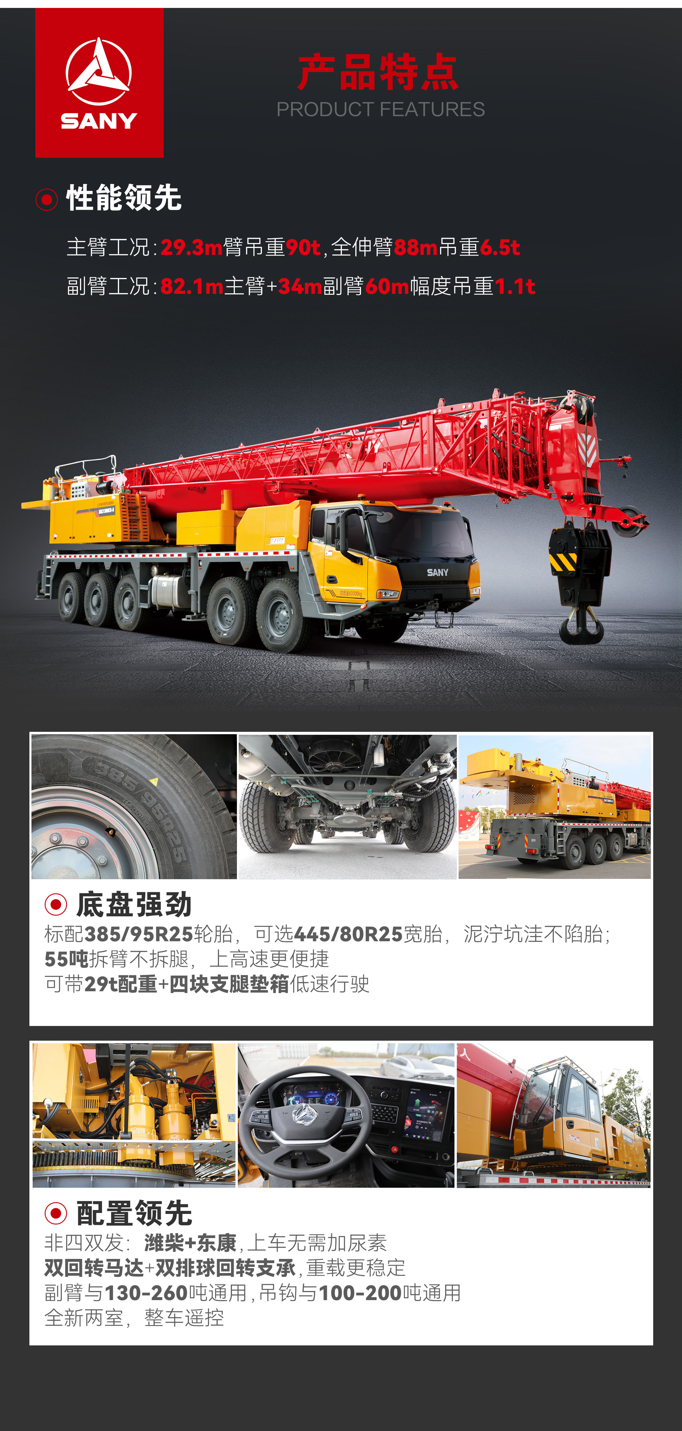 主臂工况:29.3m臂吊重90t,全伸臂88m吊重6.5t